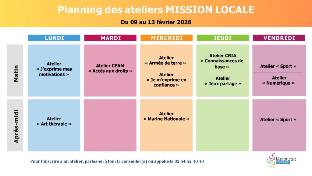 Pour obtenir des informations supplémentaires sur les ateliers ou pour vous inscrire, n’hésitez pas à contacter directement votre conseiller ou notre standard au 02 54 52 40 40 ou à l’adresse mail : secretariat@mlblois.com.