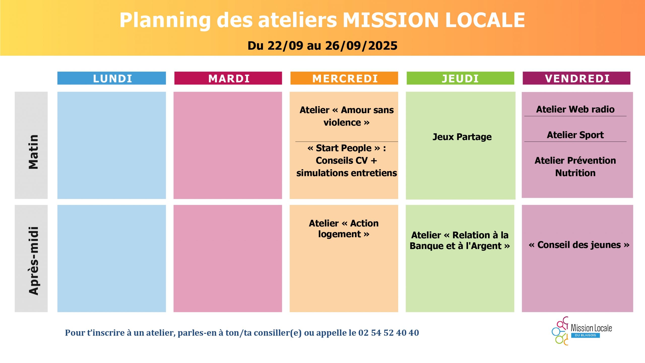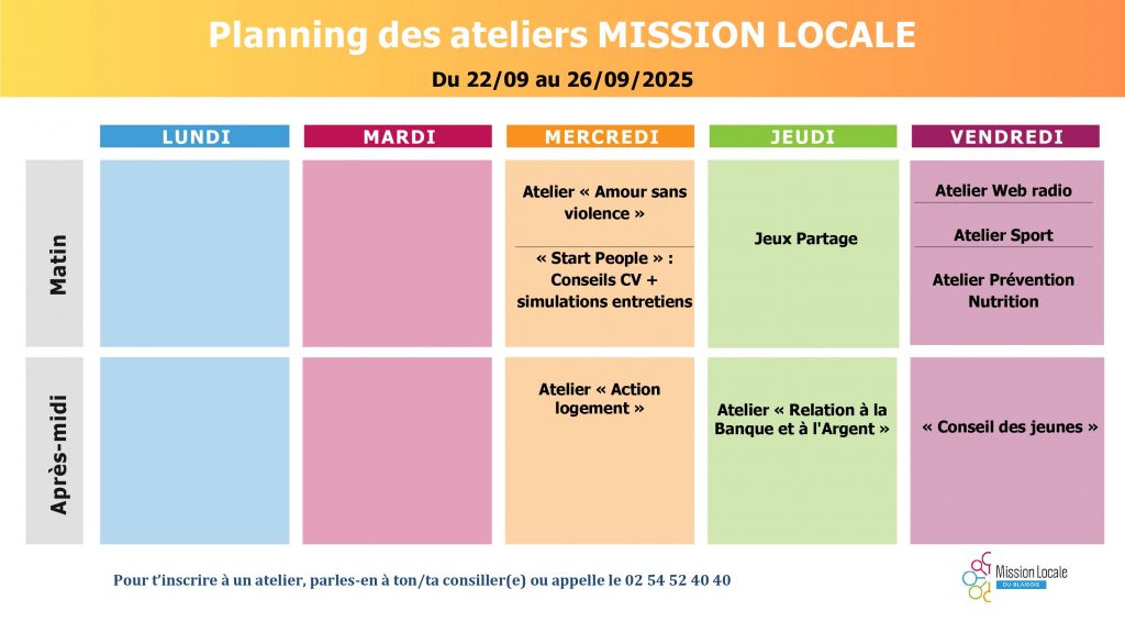 Pour obtenir des informations supplémentaires sur les ateliers ou pour vous inscrire, n’hésitez pas à contacter directement votre conseiller ou notre standard au 02 54 52 40 40 ou à l’adresse mail : secretariat@mlblois.com.
